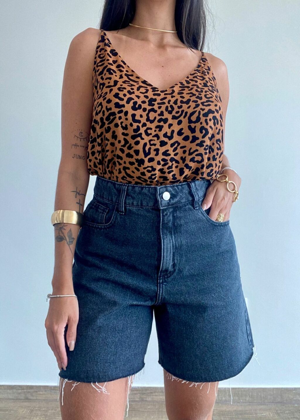 - Blusa Antonela animal prit, modelagem solta, com decote em V, alças finas com regulagem.
