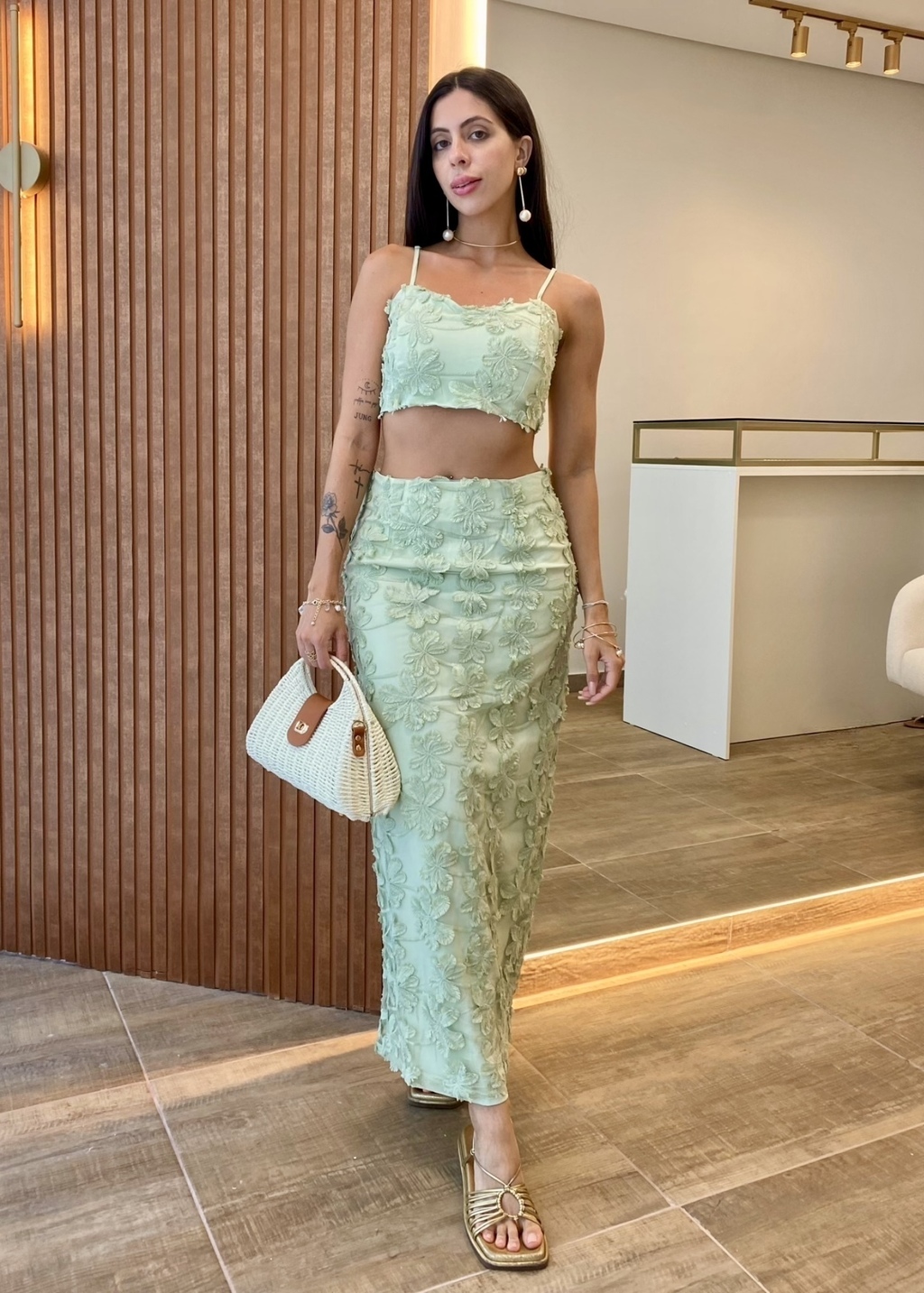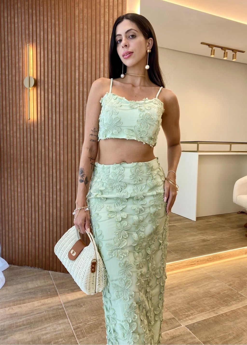 - Conjunto Lumis. Modelagem em saia e cropped. Uma peça toda trabalhada com detalhes em flor em tricô, e uma proposta em tule em segunda pele. O cropped possui lastex na parte de trás, trazendo mais conforto. Saia com feicho em zíper na parte de trás, modelagem cintura intermedia.