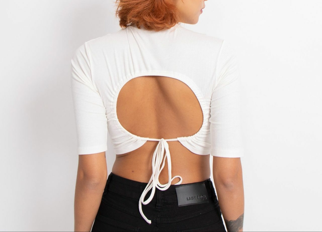 - Cropped confeccionada em malha canelada, mangas 3/4, abertura e amarração nas costas.