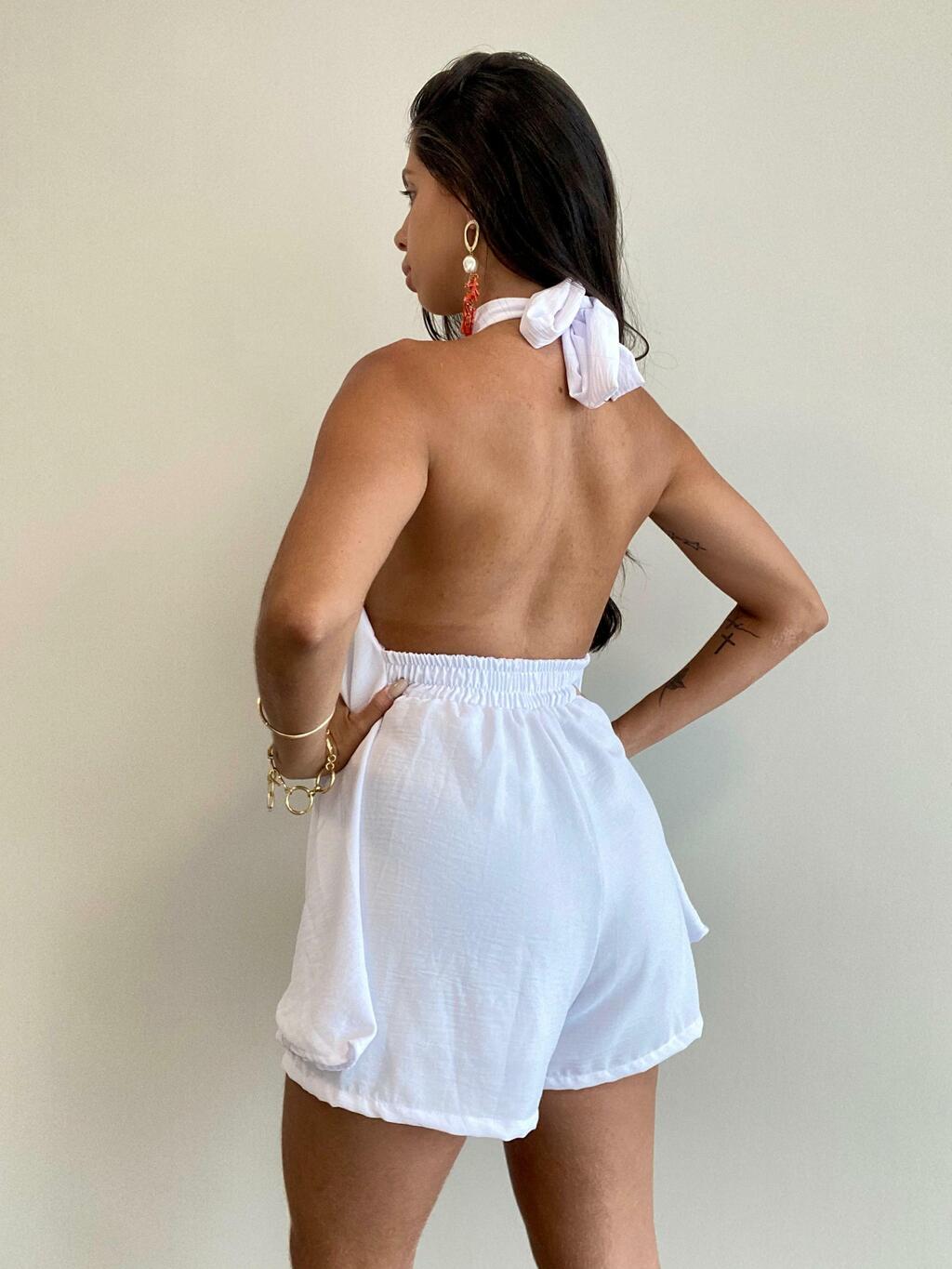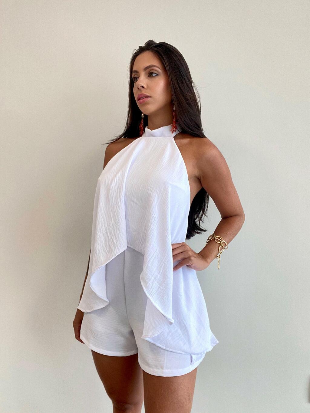 - Macaquinho Sereno, em Duna Air Flow, frente única e decote nas costas. Possui amarração na parte de trás do pescoço, babados no comprimento e elástico na parte de trás da cintura e lateral da blusa. Possui forro.