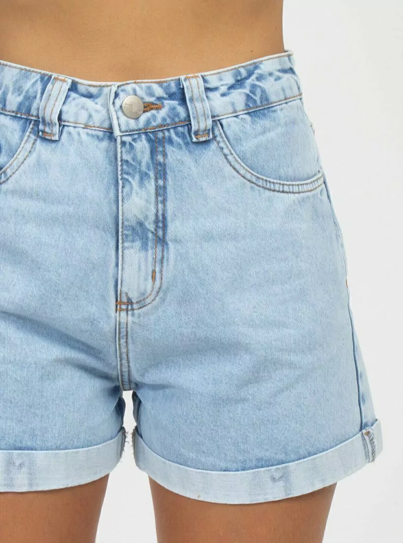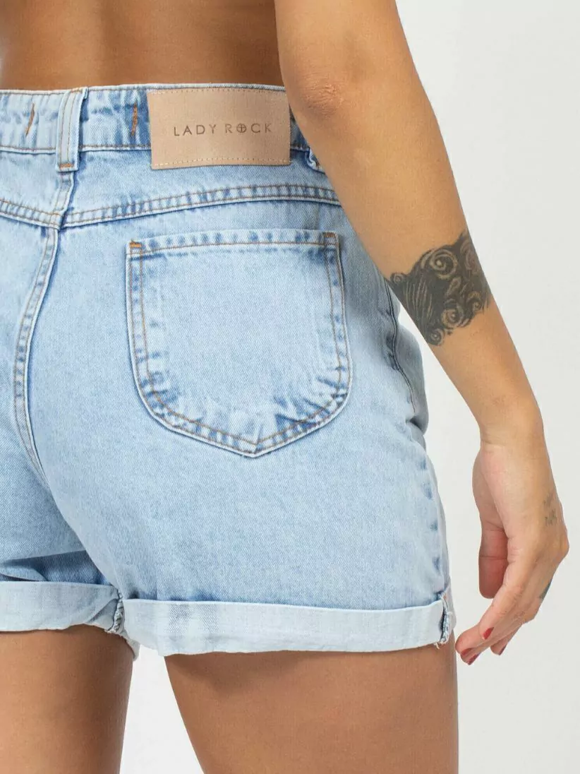 - Short mom jeans, confeccionado em jeans de algodão, cintura alta, lavagem clara e barras dobradinhas. Possui passantes, bolsos frontais e posteriores, fechamento por botão e zíper.