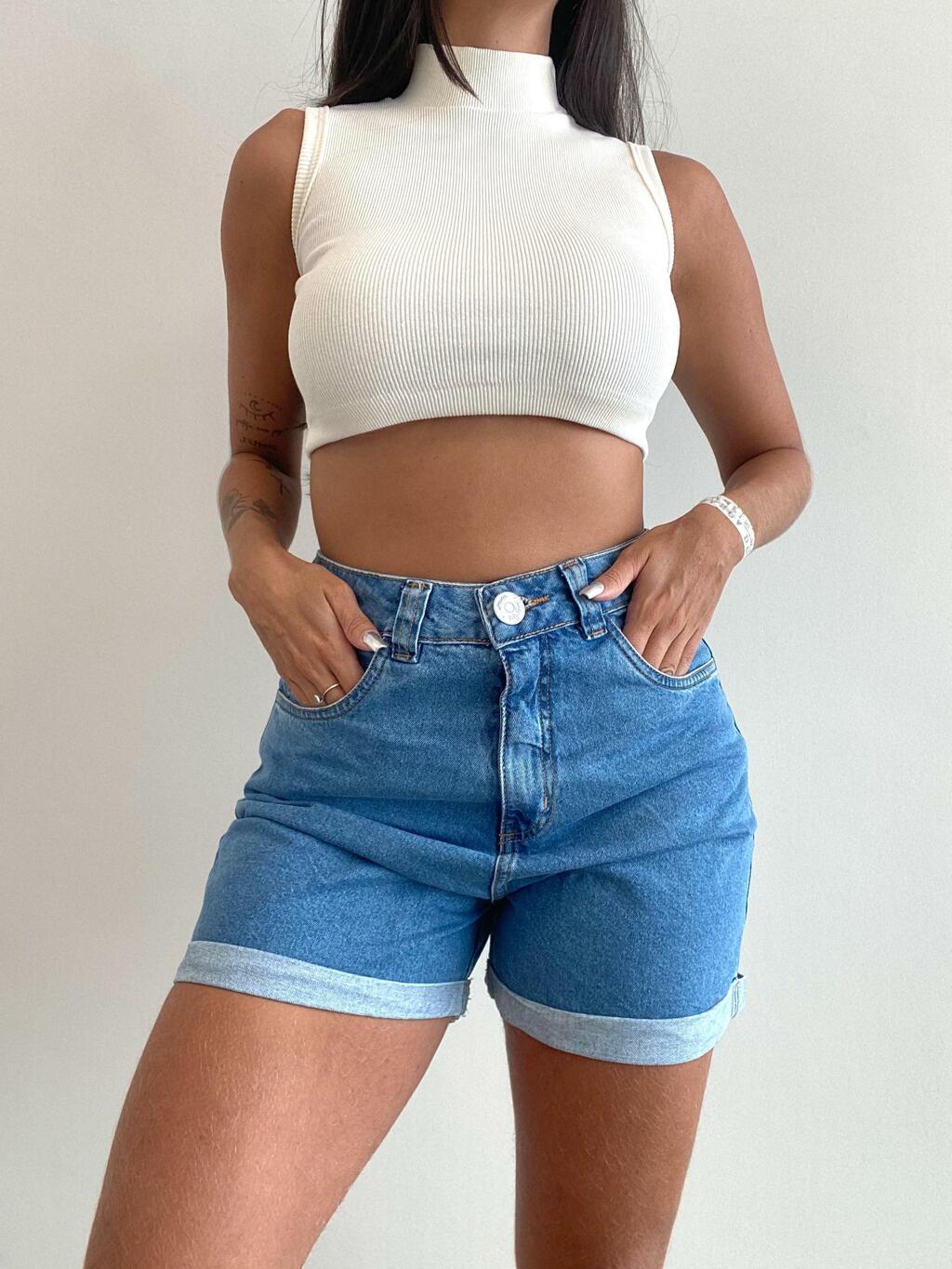 - Short mom jeans, confeccionado em jeans de algodão, cintura alta, lavagem média clara e barras dobradinhas. Possui passantes, bolsos frontais e posteriores, fechamento por botão e zíper.