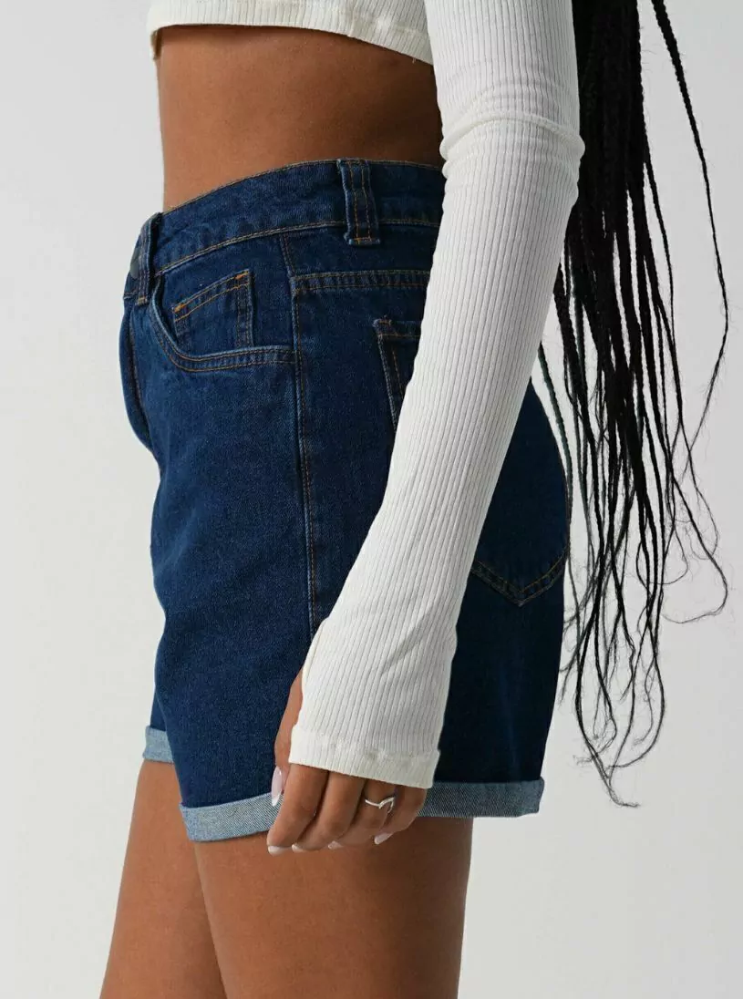 - Short mom jeans, confeccionado em jeans de algodão, cintura alta, lavagem escura e barras dobradinhas. Possui passantes, bolsos frontais e posteriores, fechamento por botão e zíper.