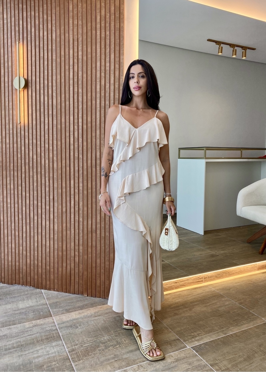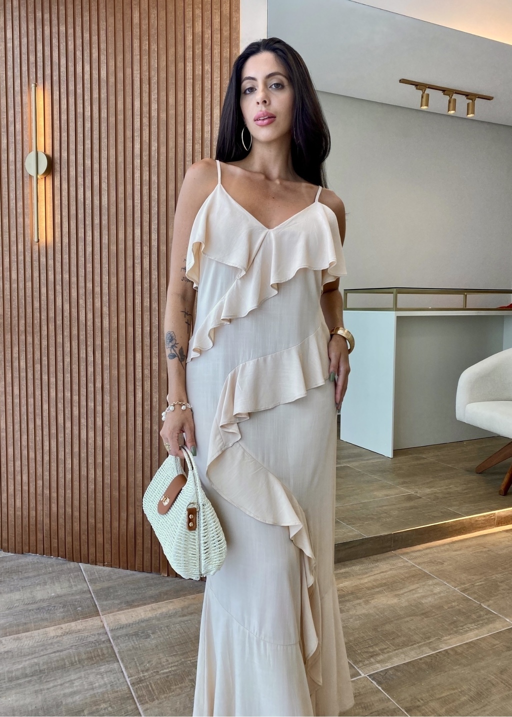 - Vestido Riva em babado com o caimento perfeito. Possui alça com regulagem, fenda na lateral e feicho em zíper.